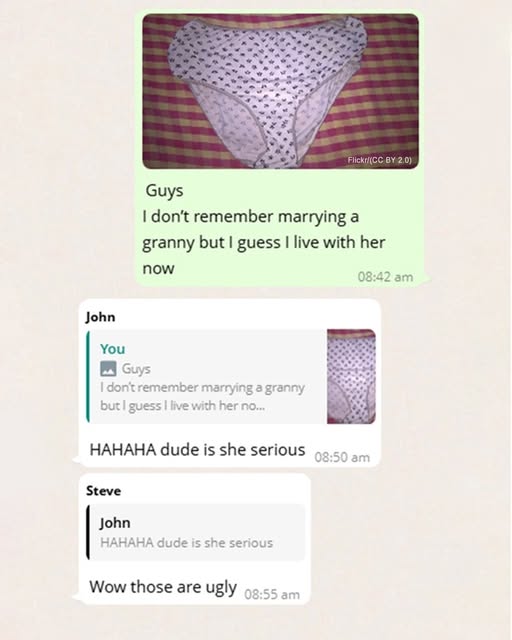 I found myself staring at a group chat between Tom and his friends. There, next to a picture of my practical, plain underwear, was his comment: “I don’t remember marrying a granny. 😆🤣”