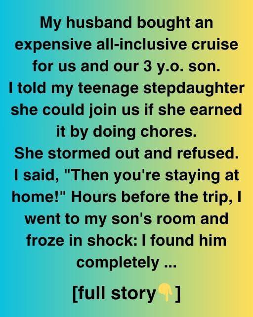 Our husband arranged an expensive all-inclusive cruise for us and our 3-year-old son. My teenage stepdaughter may join us if she did chores. Stormed out and declined. I said, “Then