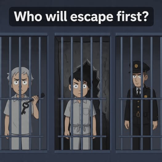 The middle prisoner will escape first. Here’s why: The prisoner on the left has a key, but the key is too big to fit through the bars or unlock anything in front of him. The prisoner