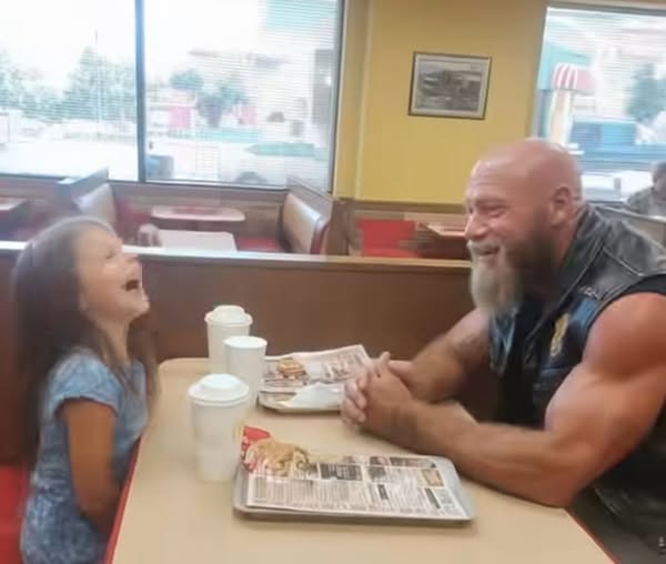 For months, whispers spread around town about the same intimidating figure who showed up at the local McDonald’s every Saturday. He was hard to miss—a towering man in black leather,