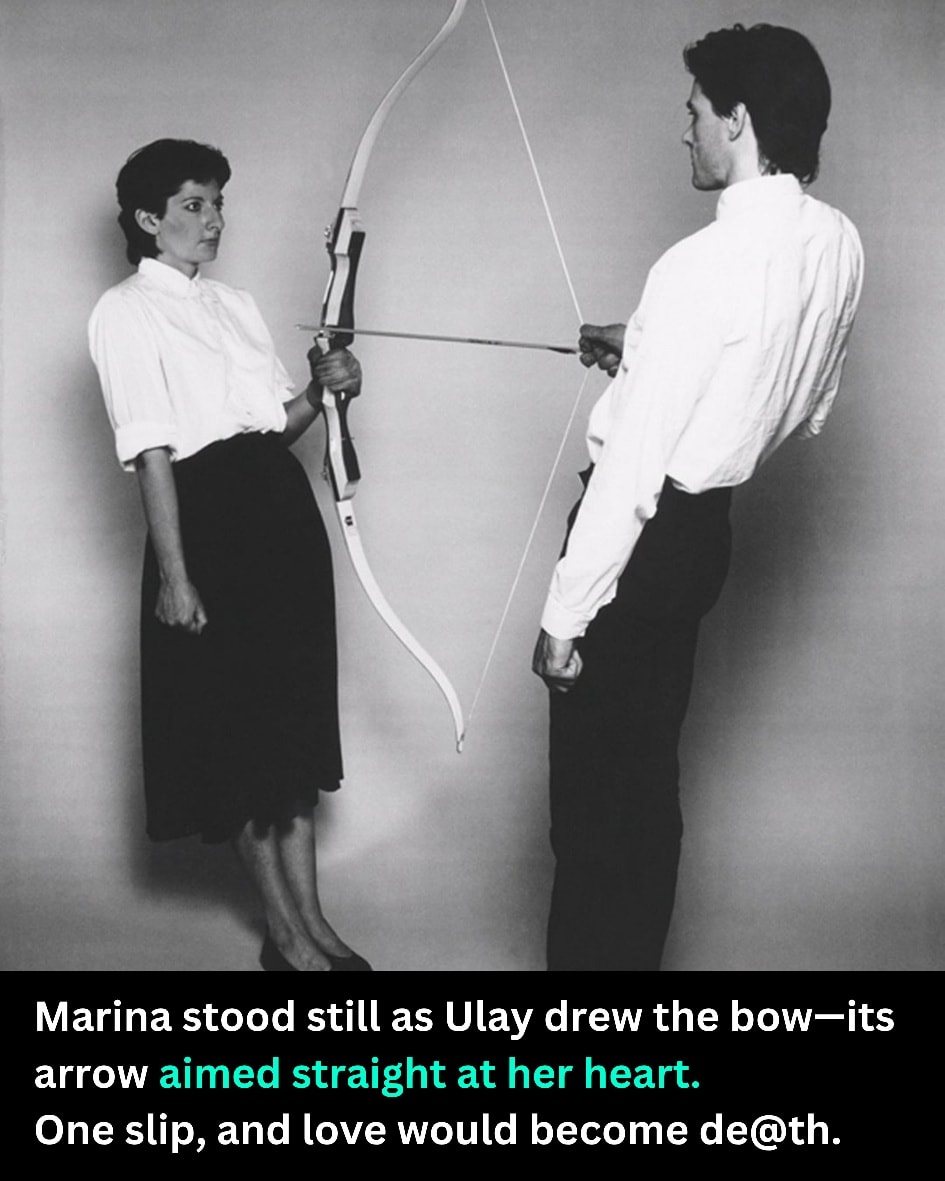 The striking black and white image captures a moment of breathtaking tension, a scene from an iconic performance art piece by Marina Abramović and Ulay titled “Rest Energy.” The accompanying