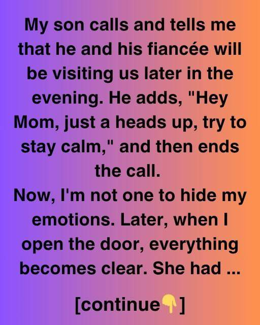 My son phones to say he and his fiancée will visit us later that night. He says, “Hey Mom, just a heads up, try to stay calm,” and hangs up.