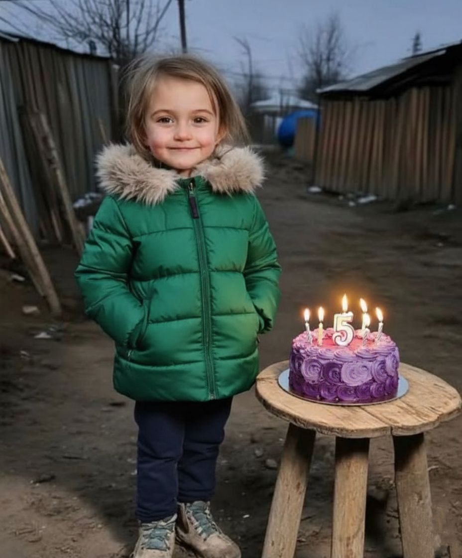 In a humble setting, against a backdrop of weathered fences and simple homes, a radiant smile lights up the face of a young girl, celebrating a significant milestone. Today, she